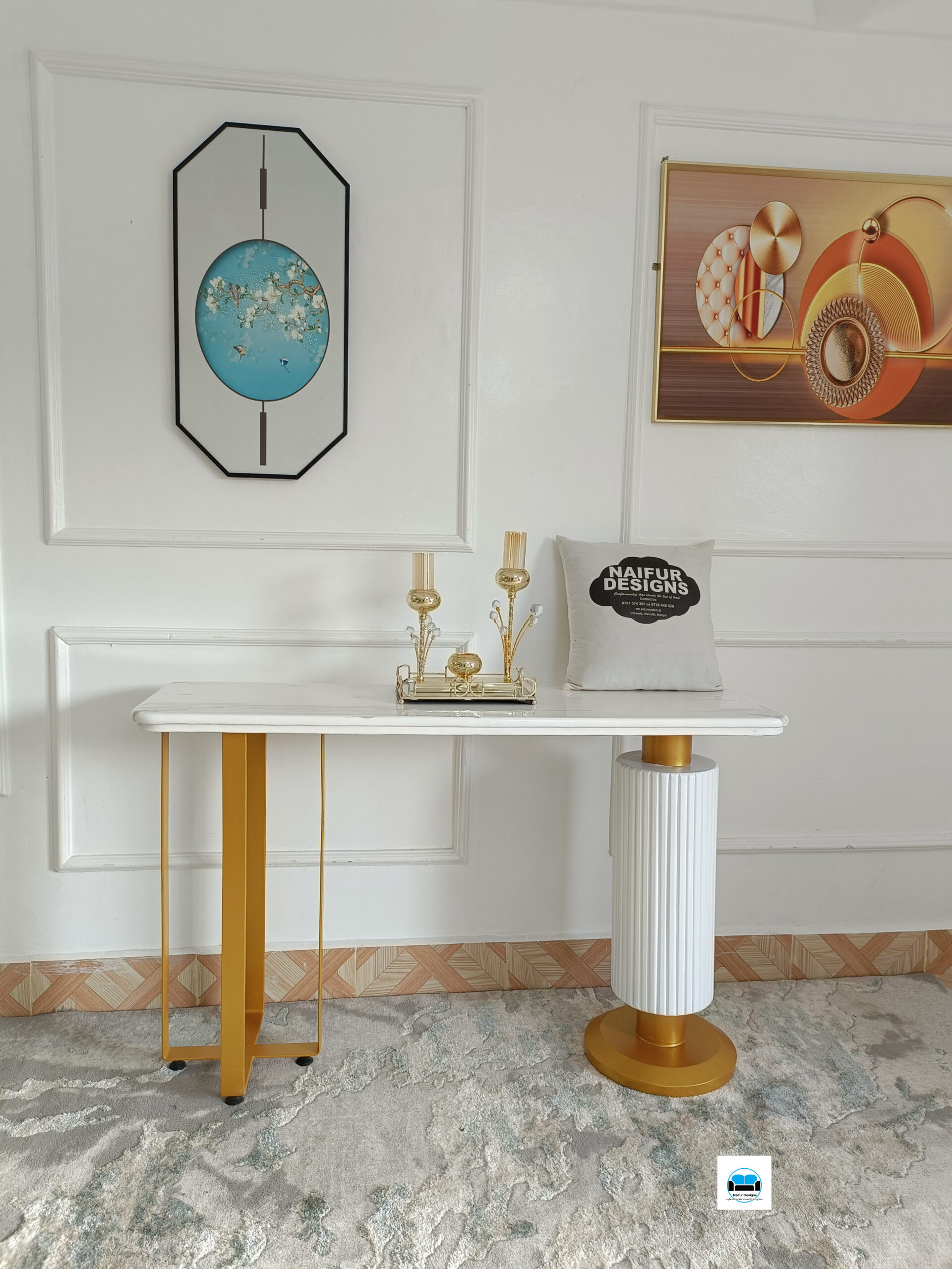 Elevate your entryway with this striking rectangular console from Naifur Designs. Featuring a sleek white finish paired with refined gold accents, it brings a perfect balance of modern simplicity and luxurious detail. Its elongated design creates a bold yet elegant presence, ideal for hallways or entrance spaces. The smooth surface offers ample room for décor, from vases to statement pieces, while maintaining a clean, uncluttered look. Crafted for both style and durability, this console transforms any pathway into a sophisticated focal point, setting a warm, stylish tone for the rest of your home.